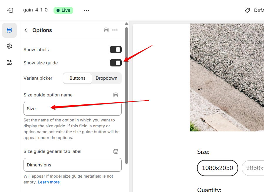 In this block, you can also specify the option where the Size guide button will be placed. If this field is empty or the option name does not exist, the size guide button will appear under the options.