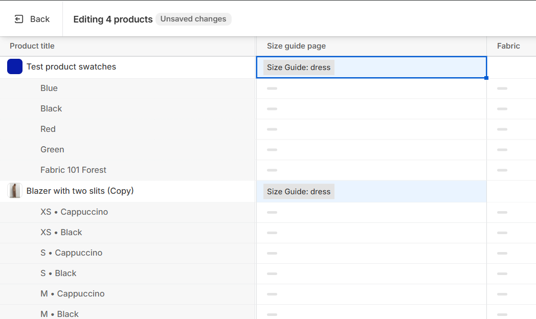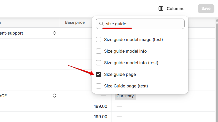 This action will add the column with that metafield to your table. Now, scroll horizontally until you find this column. Add the size guide page to the first product and then drag this cell all the way down the column so that the page is added to all other products as well.