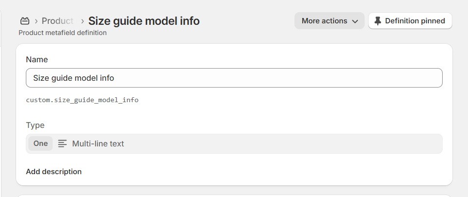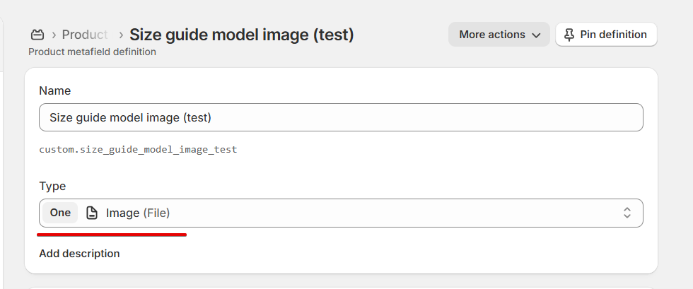 Navigate to the Product metafields and create a metafield to store the model image with the following parameters.