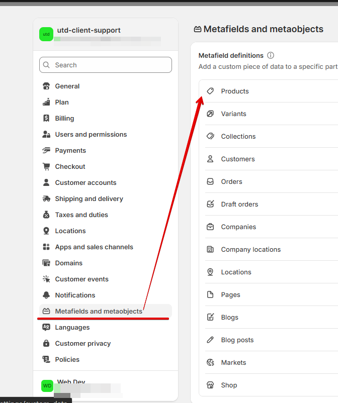 Navigate to the Shopify Admin -> Settings -> Metafields and metaobjects -> Products and click on the "Add definition" button.