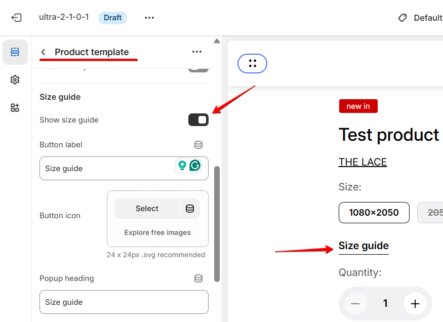 Step 4: Enable the Size guide button in the Product template
