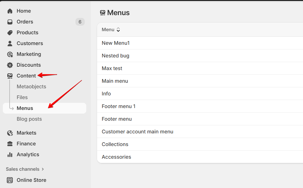 To create and set up a menu, please navigate to the Shopify admin -> Content -> Menus and click the Create menu.