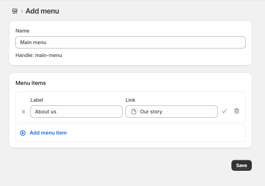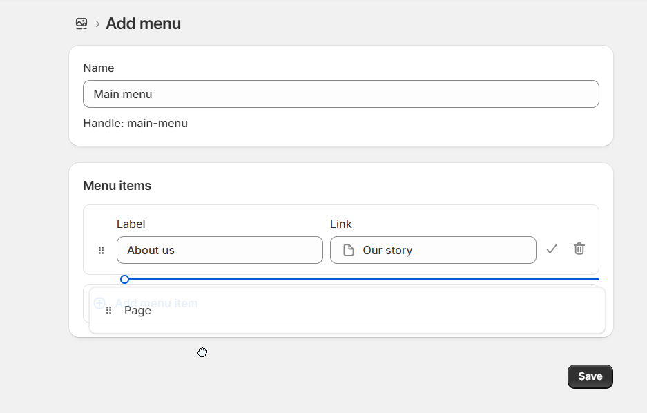 You can also create a nested menu item (sub-menu). For this, please create another menu item, click on the icon on the left side of a menu item, and drag it to the right and place it under the needed menu item. Using this approach, you can create up to three levels of the menu, since according to Shopify's limitation, you may not have more than three menu levels.