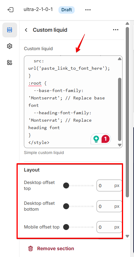 Enter this section and paste the code provided below. Replace all the Montserrat and Roboto mentions with the font name you use.