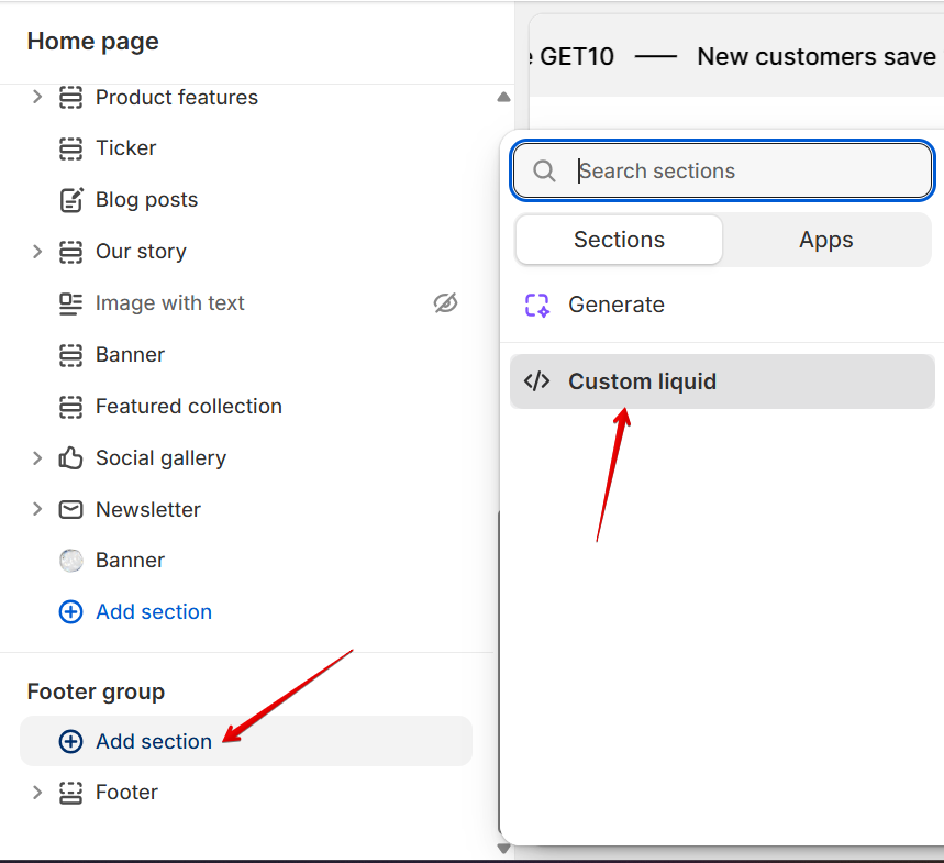 Navigate to the Theme customizer and add a Custom Liquid section to the Header or Footer group. To avoid the section from visually disturbing you in the future, we recommend adding it to the Footer Group.