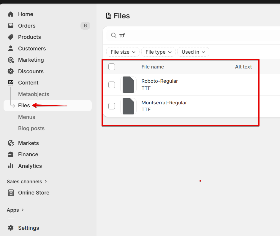Navigate to the Shopify admin -> Content -> Files, click on the "Upload files" button, and select the font file from your device.