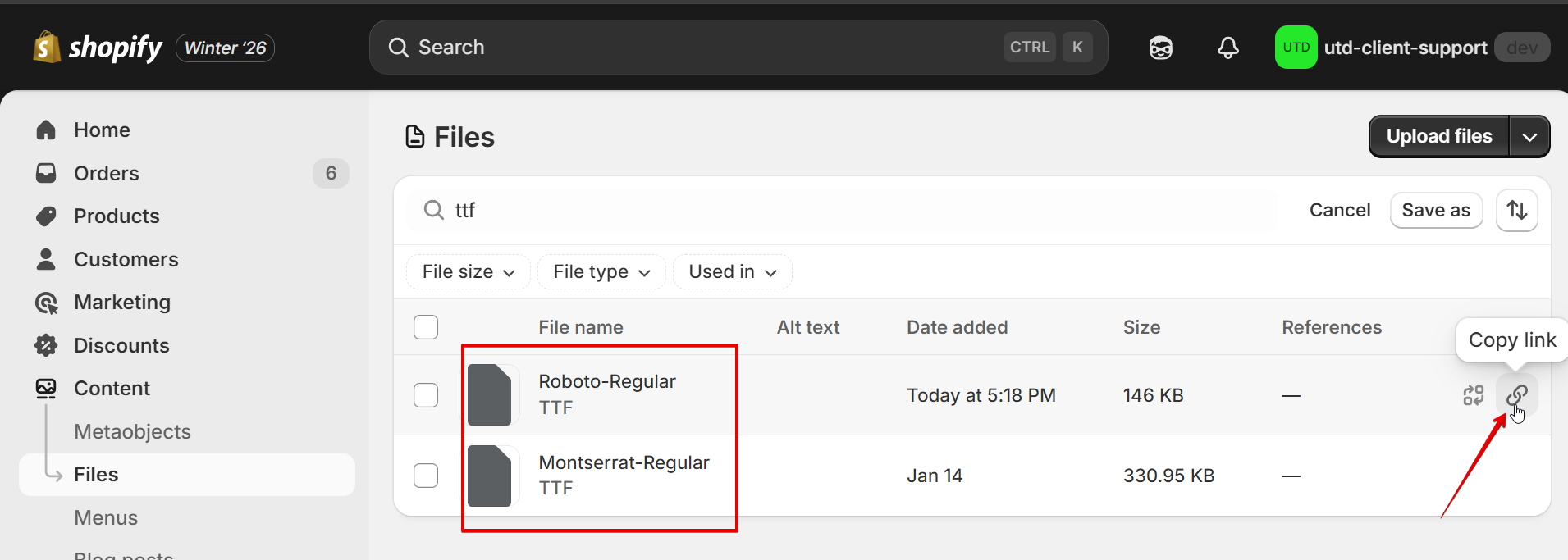 Navigate to the Files in your Admin panel, hover the mouse over the font file, and click on the "Copy link". Return to the code we provided and paste the link as the value of the src: url('paste_link_to_font_here'); property.