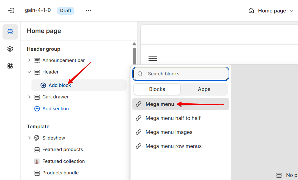 After that, add the "Mega menu" block to the Header section.