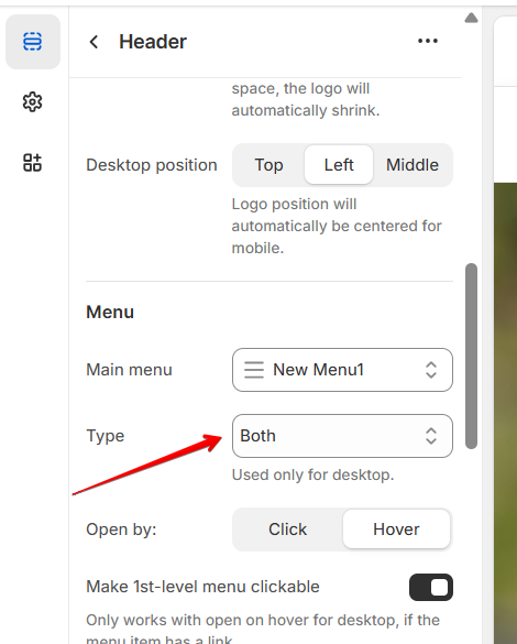 Once the menu is set up, please navigate to the Theme customizer -> Header and ensure that under the Menu block settings, the "Type" is set to "Both" or "Mega menu".