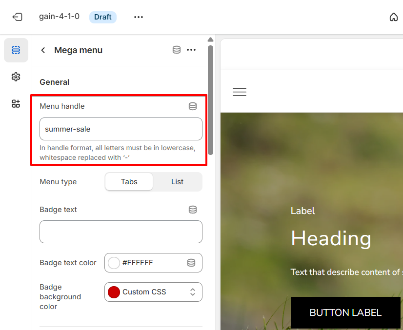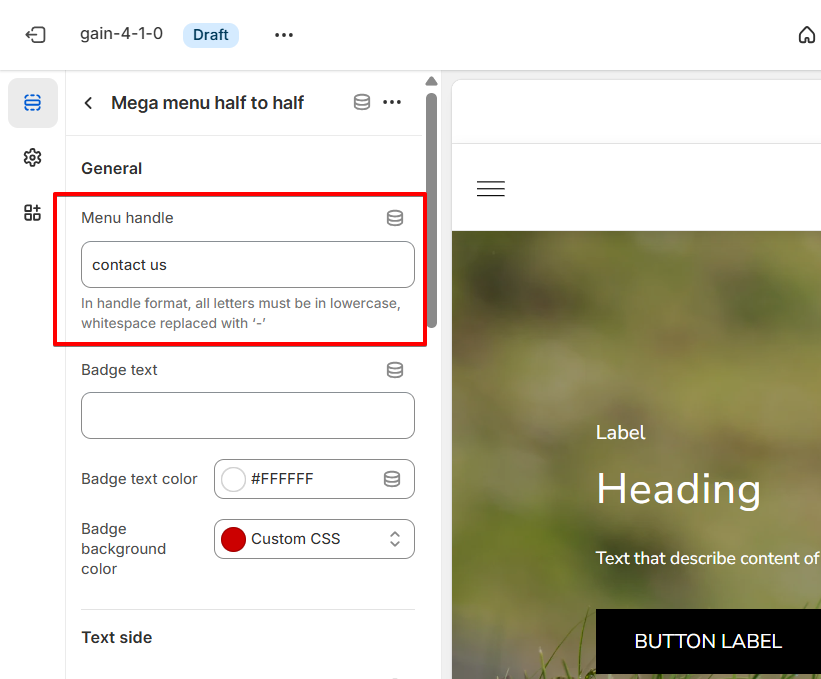 After that, enter the block's settings and fill in the Menu handle field with the value that matches the menu item you want to connect this mega menu block to.