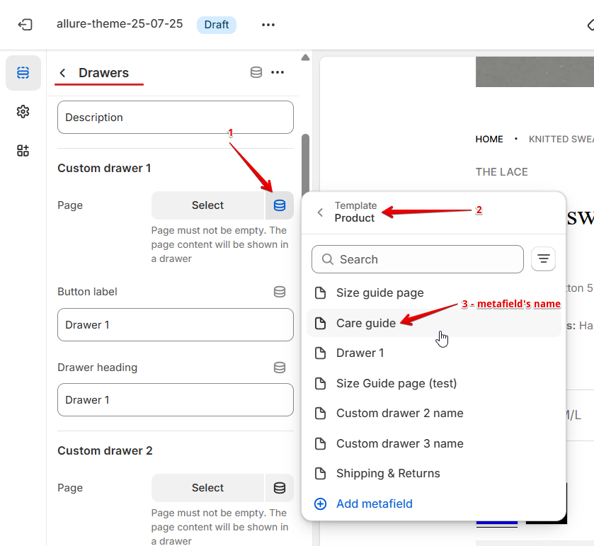 Navigate to the Product page in the theme customizer, enter the Drawers settings, click on the "Connect dynamic source" button (1), ensure that you are in the correct directory - Template > Product (2), and then select the metafield name (3) from the list.