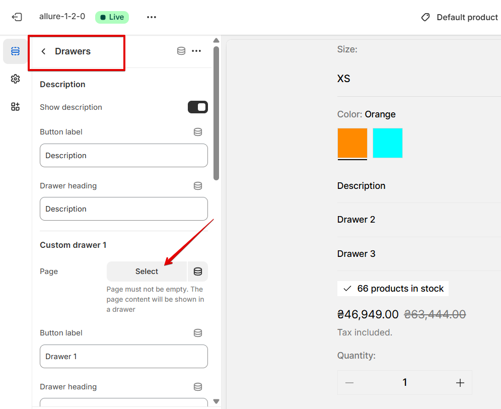 Navigate to the Theme editor -> Product page -> Product template -> Drawers, and connect the page we just created to the Drawer content field.