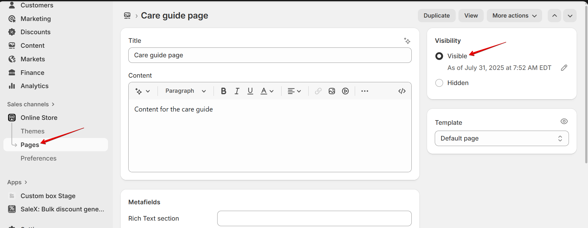 Navigate to the Shopify admin -> Online store -> Pages and create a new page. Fill in the title and the content fields. Ensure that Visibility is set to Visible.