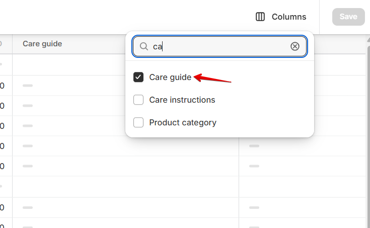 In the opened window, in the top right corner, click on the "Columns" button. In the dropdown, find the name of your metafield or start writing its name in the search field. Select the needed metafield and close this dropdown.