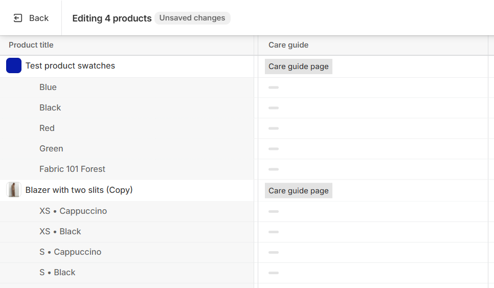 This action will add the column with that metafield to your table. Now, scroll horizontally until you find this column. Add the needed page to the first product and then drag this cell all the way down the column so that the page is added to all other products as well.
