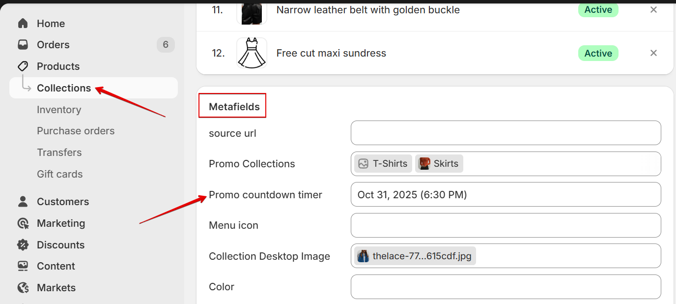 Navigate to the collection setting in the Admin panel, scroll down to the Metafields block, and add the date when the promotion ends.