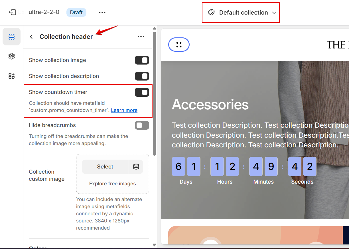 Navigate to the Theme editor -> Collection page -> Collection header, and enable the "Show countdown timer" option.