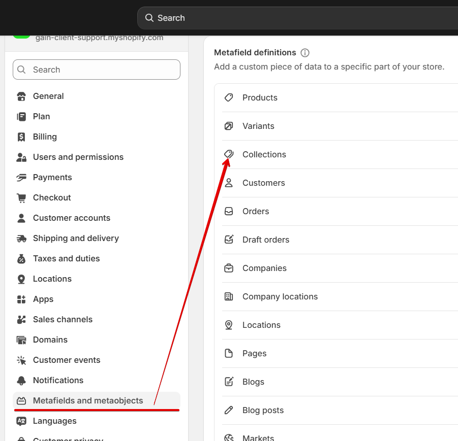 Navigate to the Admin panel -> Settings -> Metafields and metaobjects -> Collections, click on "Add definition."
