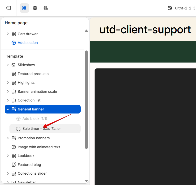 Please add the General banner section to the page, remove the default "Wide media" block, and add the "Sale timer" instead. Enter this block and set up the date when the promotion ends.