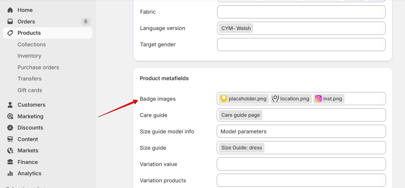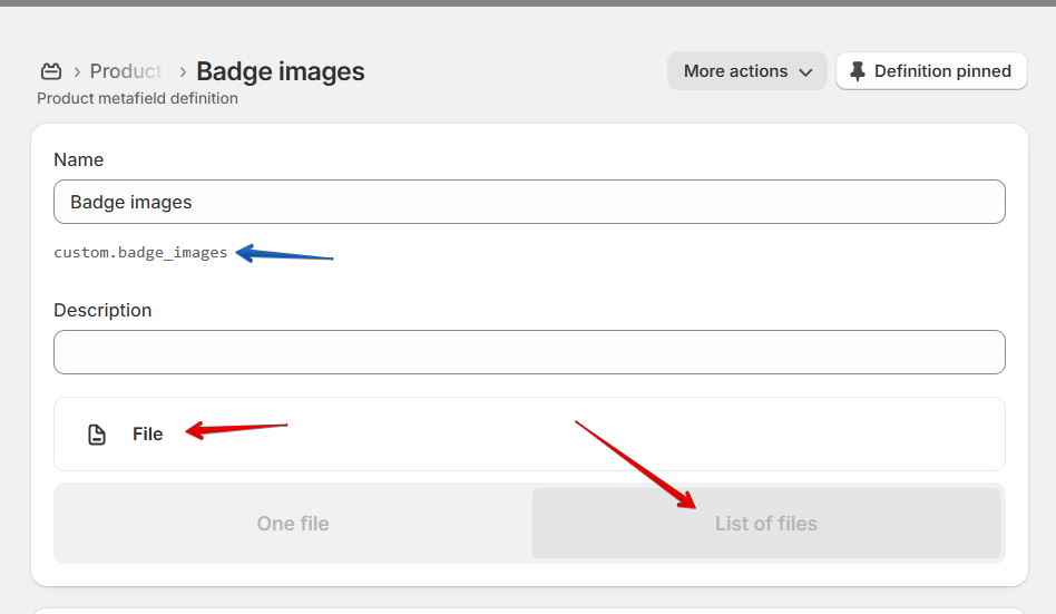 Tip: You can choose any name for the metafield that is convenient for you. However, in this case, the "Key" (the row directly under the "Name" field) must be renamed to custom.badge_images, otherwise it will not work. This "Key" is filled automatically once the "Name" is filled.