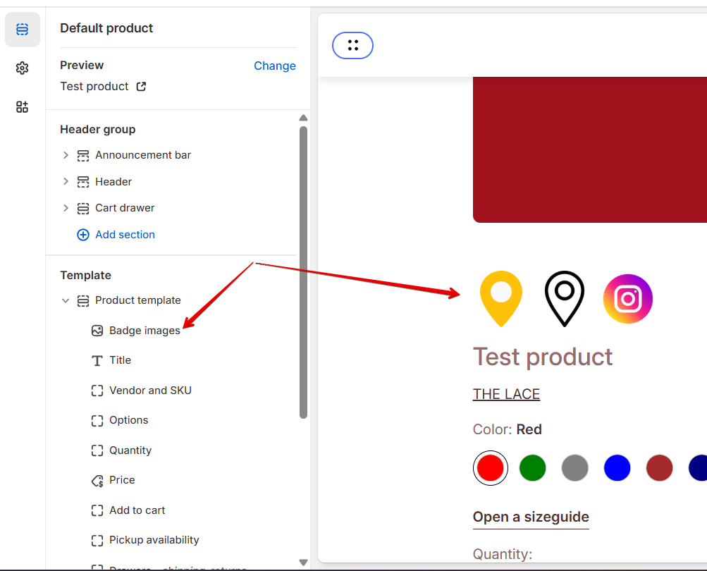 Now, navigate to the Theme customizer -> Product page -> Product template, and add the "Badge images" block to the template, and the images will be displayed on the page.