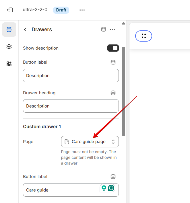 Navigate to the Theme editor -> Product page -> Product template -> Drawers, and connect the page we just created to the Drawer content field.