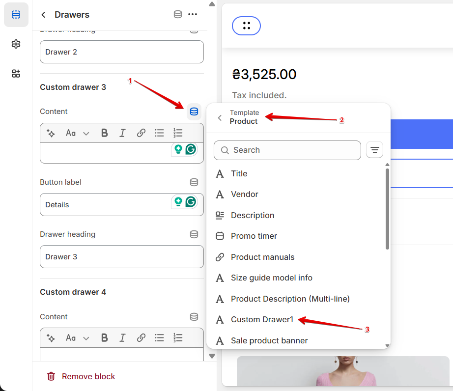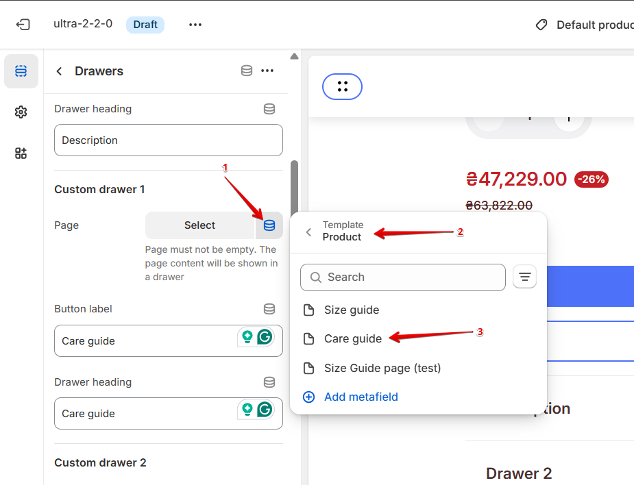 Navigate to the Product page in the theme editor, open the Drawers settings, click Connect dynamic source (1), ensure that you are in theTemplate > Product directive (2), find the metafield in the list (3), and click it to Connect.
