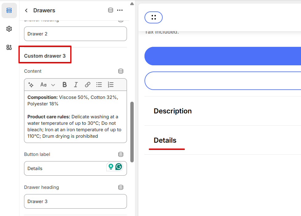 Display unique drawer content for each product in the Custom drawer 1 and 2 (in our example, it is the "Care guide")