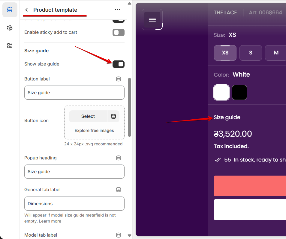 Step 3: Connect the Size Guide page to the metafield in the Product settings.