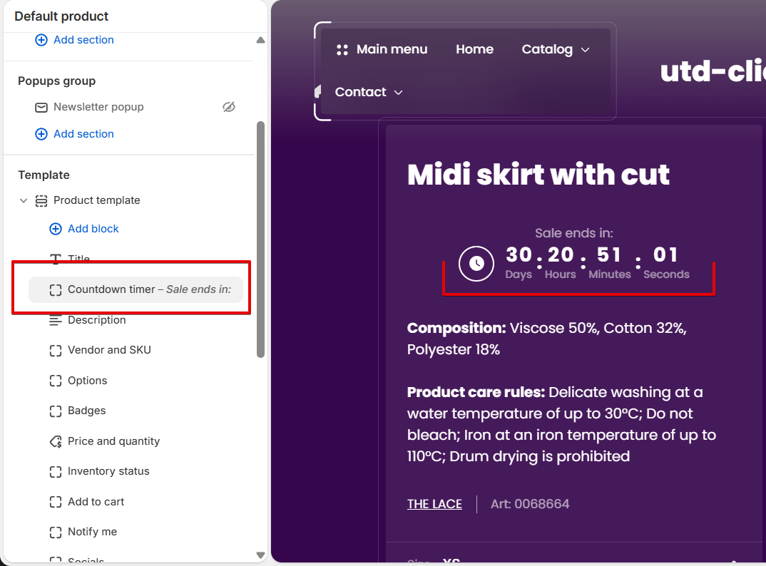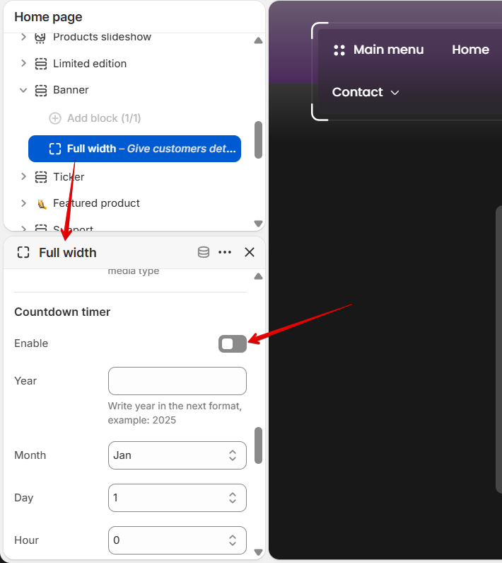 Please add the Banner section to the page, enter the "Wide media" block, scroll down through the settings until the Countdown timer block, and enable it. Then set the time when the promotion ends.