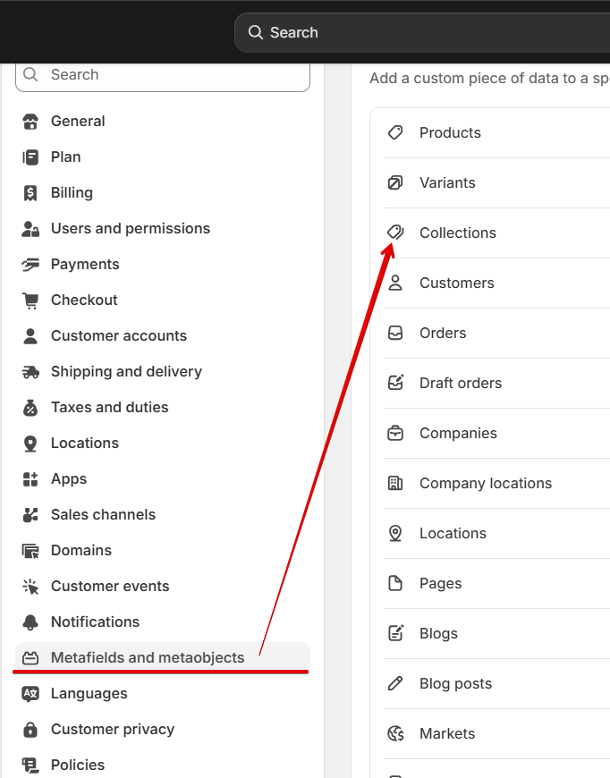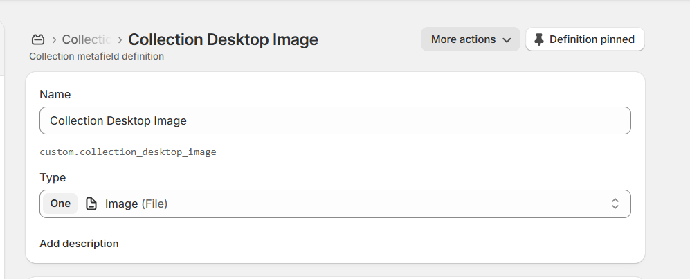 You need to have two metafields: one for the desktop image and one for mobile. For this, navigate to the Admin panel -> Settings -> Metafields and Metaobjects -> Collections, and click on the "Add definition" button.