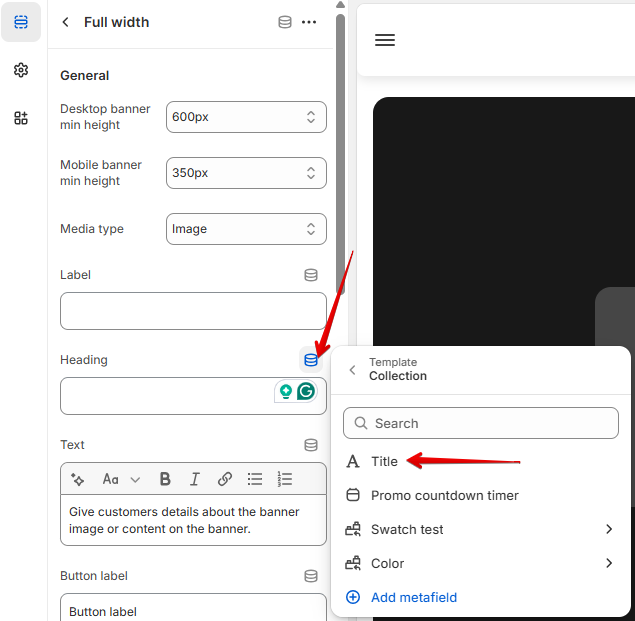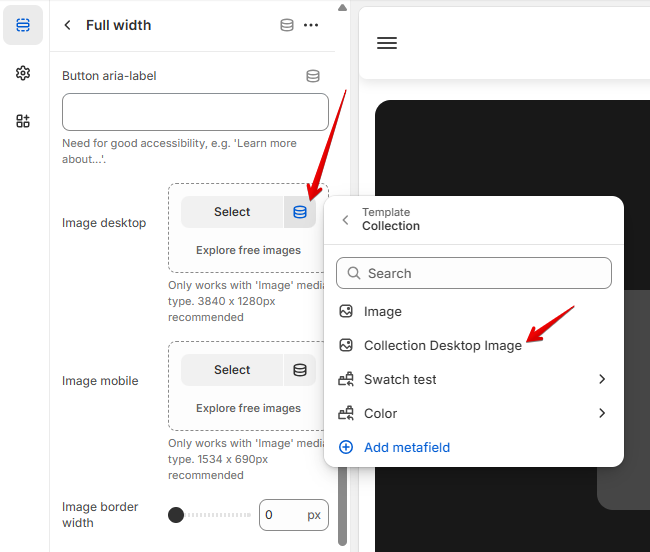 Click on the "connect dynamic source" button near the Image desktop and select the metafield that stores the image for the banner from the list. Perform the same steps for the Image mobile and select the metafield with a mobile-dedicated image.